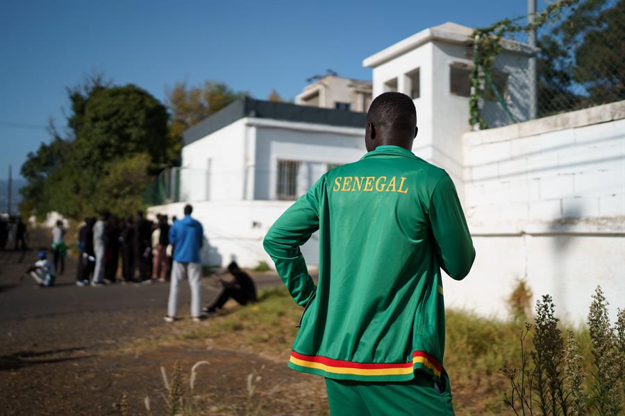 Pronto lo rodean. «Na nga def» («¿cómo estás?»), saluda en wolof. Se detiene con cada uno, estrecha manos sin parar y reparte sonrisas, pero no deja de mirar hacia el campamento, inquieto, hasta que encuentra justo en la puerta el rostro de B., su hermano mayor, el motivo por el que Thimbo Samb está estos días en Canarias.
