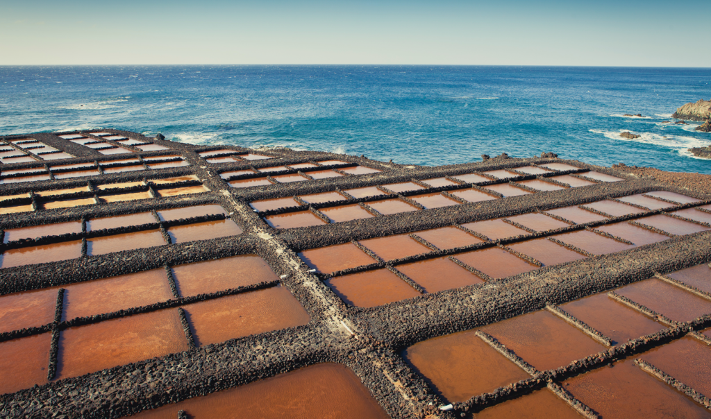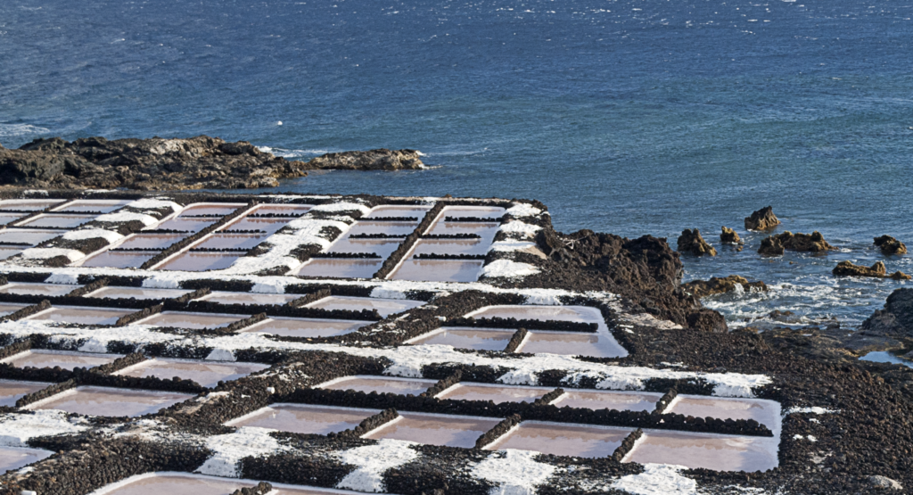 Las Salinas de Fuencaliente, en el sur de la isla de La Palma, muestra el contraste natural entre el negro volcánico, el azul del mar y el blanco salino. Un lugar que recoge la esencia de la isla y su historia.