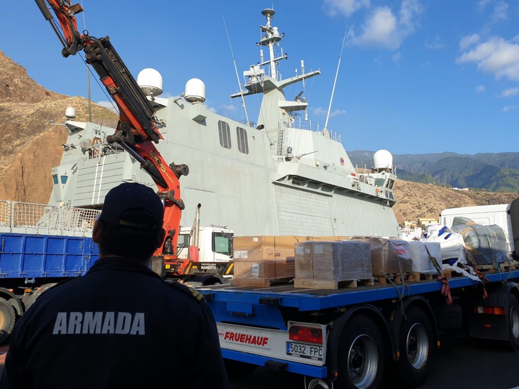 Este lunes por la mañana ha llegado al puerto de Santa Cruz de La Palma el buque de la Armada Española que transporta el material necesario para la instalación de las desaladoras.
