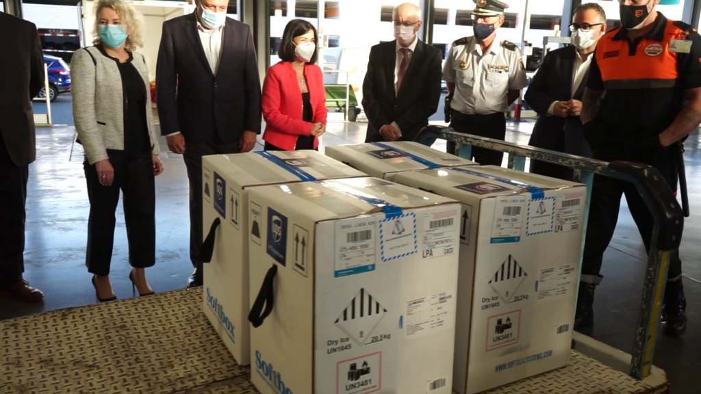 Una remesa de 43.000 dosis de la vacuna de Pfizer-BioNTech llegó este lunes a primera hora al aeropuerto de Gran Canaria, donde esperaban el consejero de Sanidad, Blas Trujillo; y la ministra de Sanidad, la canaria Carolina Darias.