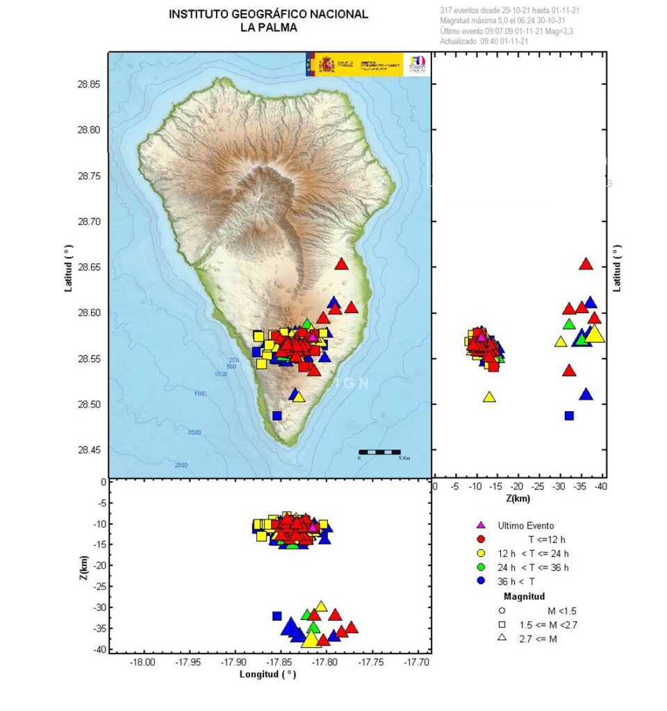 De los 69 terremotos localizados durante la madrugada 41 se han producido en Fuencaliente, 27 en Mazo y 1 en Breña Alta, éste último a las 4.56 horas y a 36 kilómetros de profundidad.