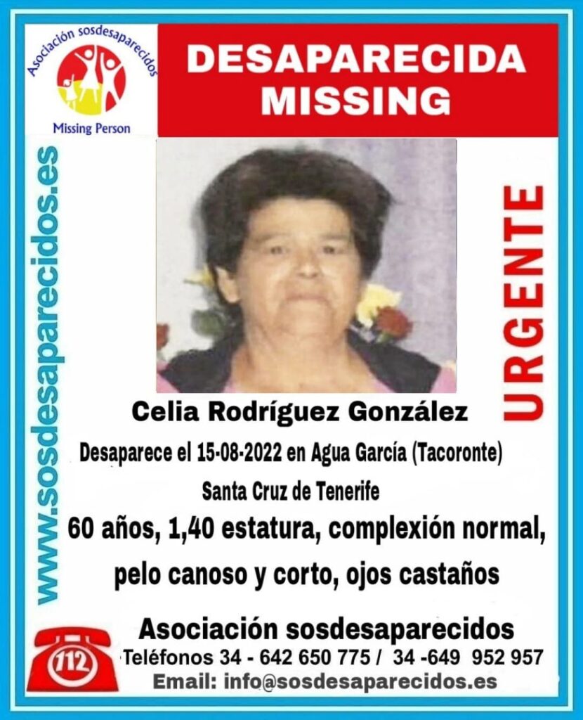 Este operativo para buscar a Celia se ha propuesto con el fin de acompañar al hijo y la familia de Celia Rodríguez, una persona que está desorientada, según consta en el expediente de su informe social. Según algunos testimonios, la vieron en los primeros instantes de su desaparición por la zona de Candelaria.