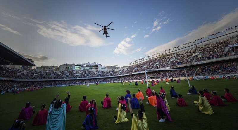 Un helicóptero del Batallón de Helicópteros de Maniobras BHELMA VI del Ejército de Tierra con base en Los Rodeos, sobrevoló el recinto deportivo para anunciar la proximidad de Sus Majestades, que aparecieron con sus respectivos séquitos de pajes y embajadores.