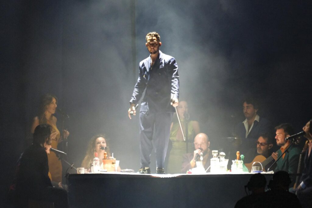 Antón Álvarez Alfaro, conocido mundialmente como C. Tangana, no llegó solo, le acompañaron mas de 40 personas, orquesta, zancudos y en un momento creó su propio festival. Un poco de rap de aperitivo y un montaje completo para crear una cena elegante sobre el escenario. El rapero madrileño aterrizó como un huracán, aún cojeando y con bastón, porque «nada me iba a impedir estar aquí», gritó al público.