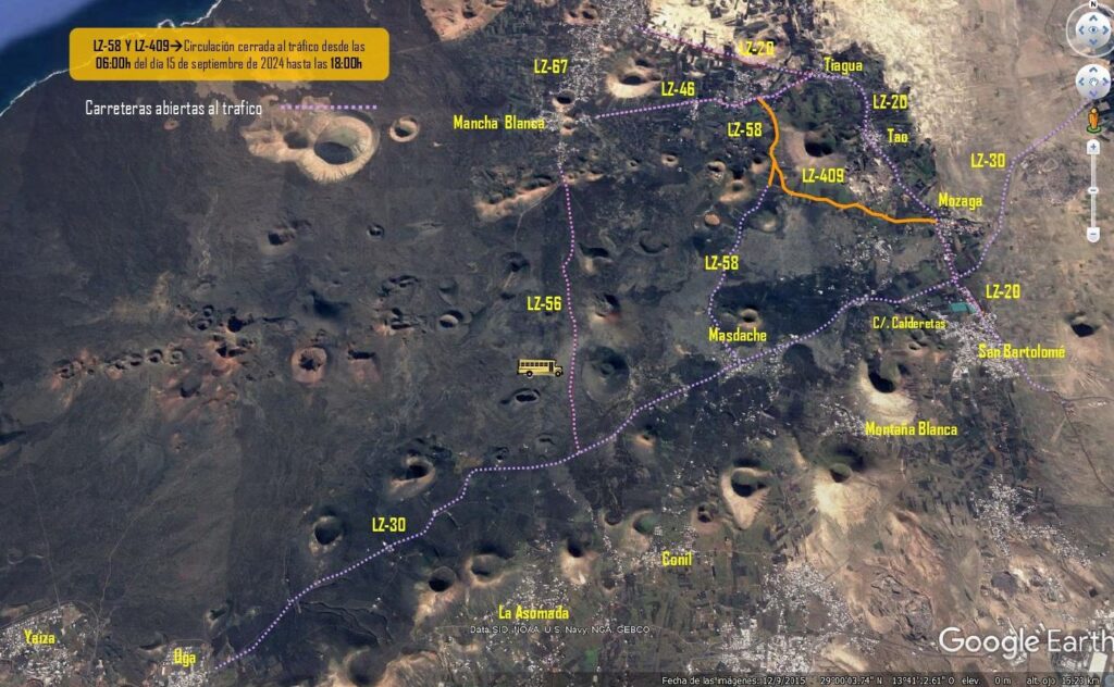 La LZ-30 (Carretera que une desde Uga a Teguise pasando por La Geria y Masdache), desde su intersección con la LZ-20 (carretera que une Arrecife y San Bartolomé) hasta C/Las Calderetas, estará cerrada al tráfico desde las 8:00 hasta las 22:00h del sábado 14 de septiembre. Mientras que desde Las Calderetas hasta La Florida solo permanecerá cerrada desde las 11:30 horas hasta las 12:30 de ese mismo día.
