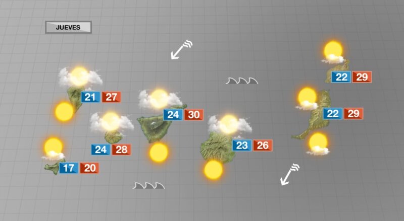 Este jueves la nubosidad de tipo bajo será la protagonistas por el Norte y Nordeste de las islas más montañosas, así como por el Norte y Oeste de Lanzarote y en La Graciosa, incluso, nos podrán dejar algunas lloviznas en zonas de medianías. Tiempo soleado en el resto con una ligera calima en altura que tenderá a desparecer por la tarde. Temperaturas sin cambios o en ligero descenso en medianías y cumbres, máximas 26 – 31ºC, con algún valor local 33 – 34ºC por el Sur y Oeste de Gran Canaria.