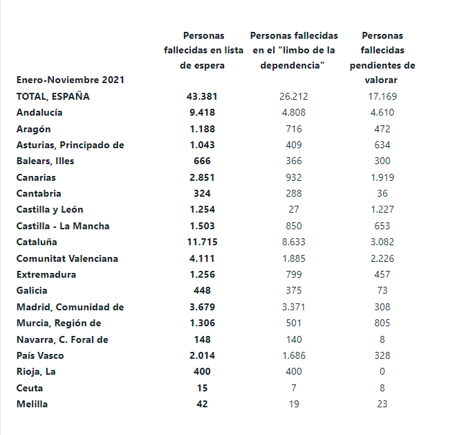 A lo largo de 2021 han fallecido 43.381 personas en las listas de espera de la dependencia. De los cuales, 26.212 son dependientes con derecho a recibir prestación y 17.169 pendientes de resolución de grado).