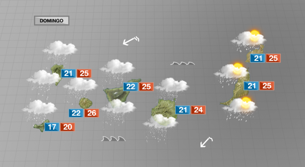 Este domingo veremos muchas nubes. Nos dejarán precipitaciones moderadas generalizadas, puntualmente en forma de chubascos. Los más intensos caerán en las islas más montañosas donde no son descartables chubascos muy fuertes y de carácter torrencial. Podrán venir acompañados de actividad tormentosa