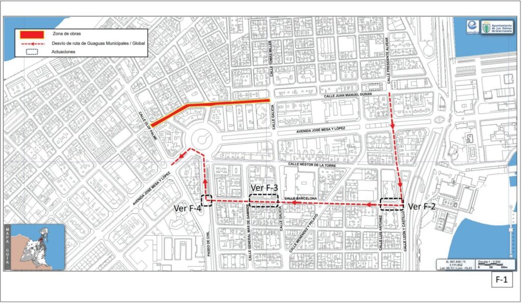 Las líneas de Guaguas Municipales y Global que transitan por el tramo afectado serán desviadas por la calle Presidente Alvear, hasta la calle Barcelona. Por Paseo de Chill, continuando por la Plaza de España (Antigua Plaza de la Victoria), y por la Avenida José Mesa y López.