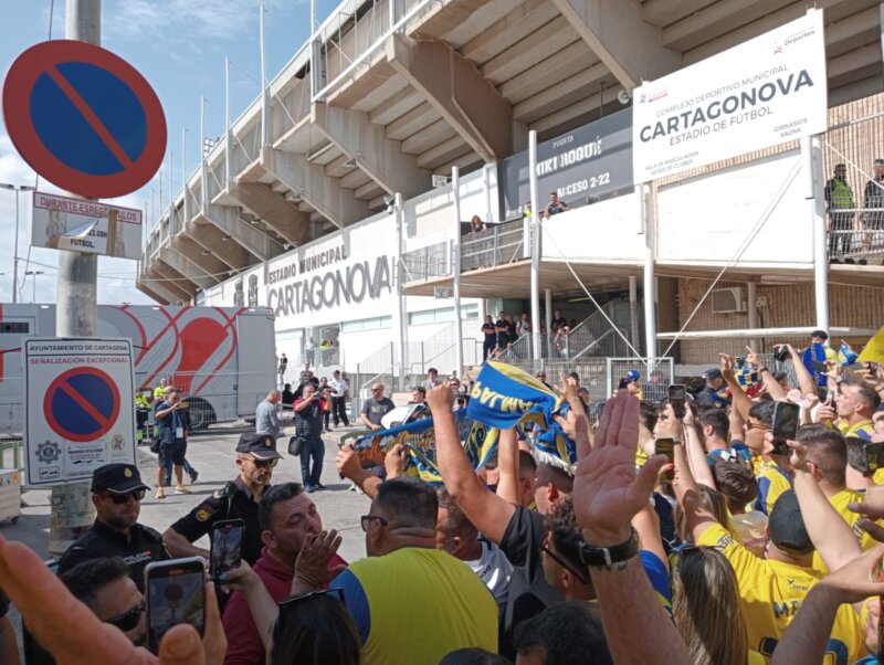Llegada de la UD Las Palmas al estadio de Cartagena Imagen aficionados de la UD Las Palmas en la entrada del estadio municipal de Cartagena