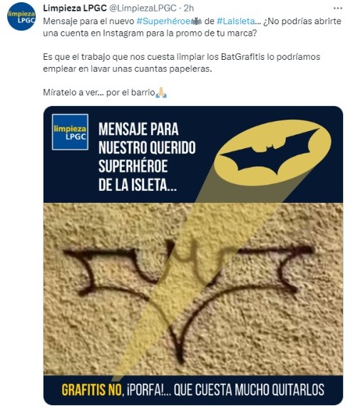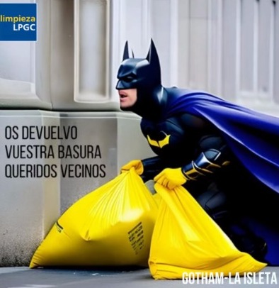 De forma irónica, el servicio de Limpieza de Las Palmas de Gran Canaria quiere hacer un llamamiento a los ciudadanos para que sean cívicos y no dejen la basura en la calle. A través de twitter escriben: «Algunos villanos de La Isleta la están convirtiendo en Gotham con el abandono de sus oscuros residuos en las calles. Desde aquí invocamos al nuevo Superhéroe del barrio para que también se los devuelva y los invite a llevarlos al Punto Limpio que queda a un pasito de su batcueva«
