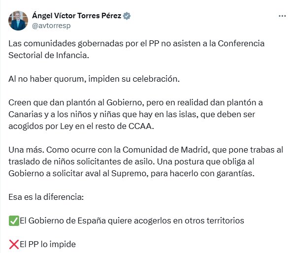 El ministro de Política Territorial ha comentado a través de su perfil en la red social X, tras el plantón del PP, que «creen que dan plantón al Gobierno, pero en realidad dan plantón a Canarias y a los niños y niñas que hay en las islas, que deben ser acogidos por Ley en el resto de CCAA». «Una más. Como ocurre con la Comunidad de Madrid, que pone trabas al traslado de niños solicitantes de asilo. Una postura que obliga al Gobierno a solicitar aval al Supremo, para hacerlo con garantías», ha añadido.