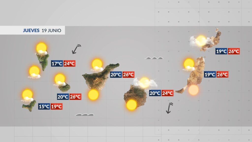 GRAN CANARIA: Cielos despejados salvo por el norte y la capital donde predominarán los intervalos de nubes bajas, más compactos a primeras y últimas horas. Temperaturas diurnas en ligero descenso, y viento del norte-nordeste moderado.