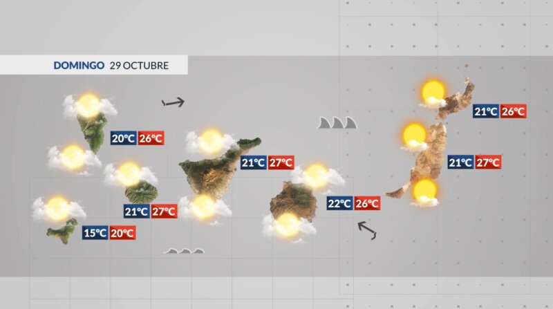 Este domingo no habrá muchos cambios en la meteorología. Veremos cielos con intervalos nubosos, que tenderán a nubosos por la tarde en las islas más montañosas, donde habrá probabilidad de lluvias débiles aisladas, sobre todo en las vertientes este por la tarde y de madrugada. En Fuerteventura, Lanzarote y La Graciosa, podremos disfrutar de amplios claros a lo largo de la jornada.