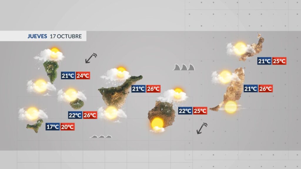Las temperaturas serán un poco más bajas que este miércoles con la entrada de los alisios que soplarán moderados podrían aumentar de intensidad en las medianías. Se acelerarán también en extremos sureste y noroeste de las islas de mayor relieve.