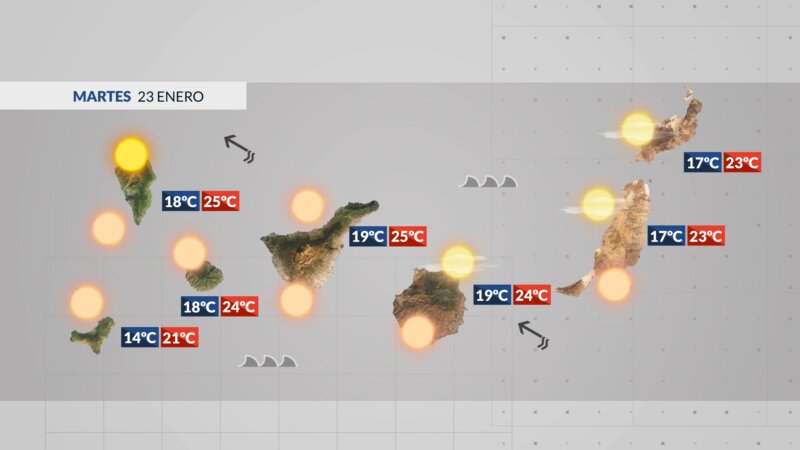 La Graciosa: Cielos despejados casi todo el día con presencia de ligera calima y con viento del sureste moderado. El termómetro irá de los 17 a los 23 grados