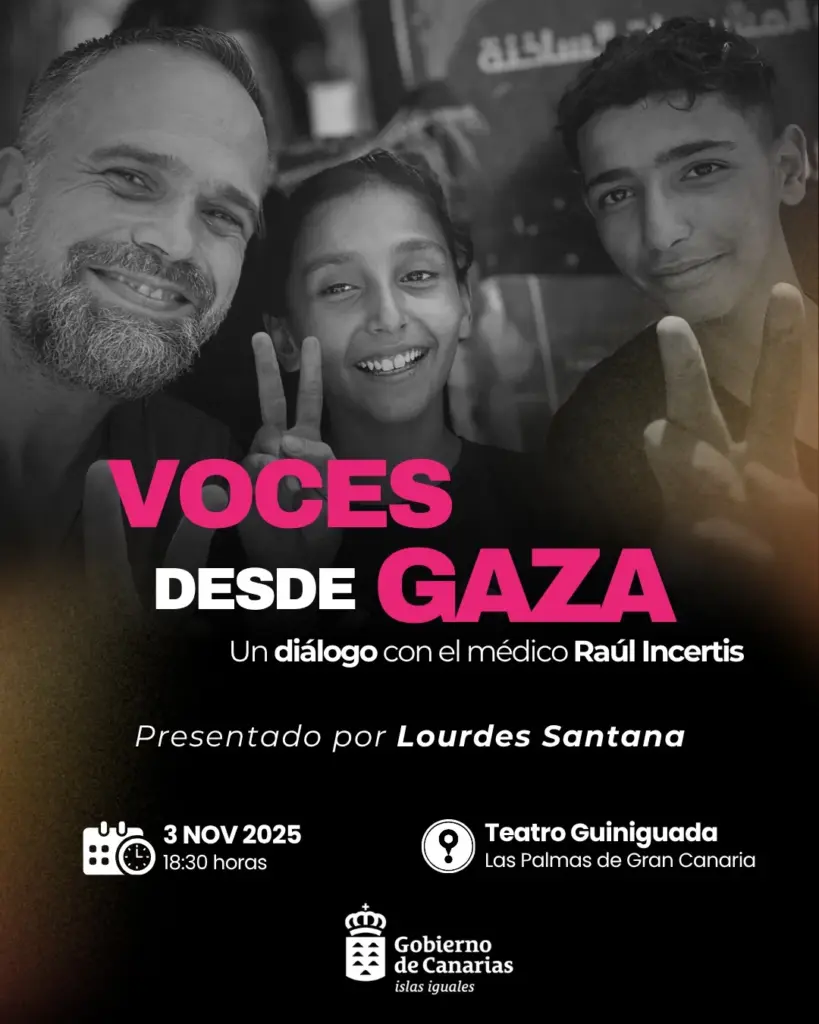Presidencia del Gobierno de Canarias organizó el encuentro Voces de Gaza: un diálogo con Raúl Incertis, en el que este médico de urgencias y anestesista continúa poniendo voz a la tragedia en la Franja y el genocidio que ha acabado con la vida de casi 70.000 palestinos, en torno a 20.000 de ellos menores, a manos de Israel.