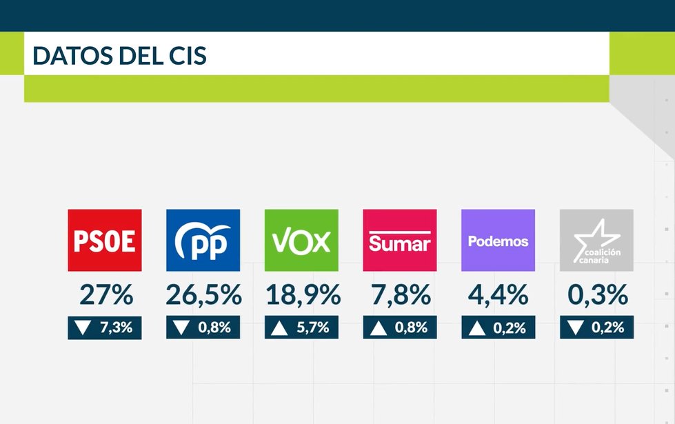 El barómetro del CIS recoge una caída del PSOE de hasta 7,3 puntos en estimación de voto. Solo medio punto más que el Partido Popular, PP y Vox se consolida como tercera fuerza política. Sube SUMAR y algo menos Podemos, mientras Coalición Canaria pierde un 0,2%.