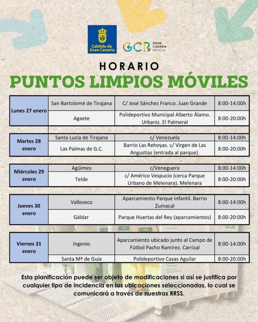 El Punto Limpio Itinerante del Cabildo de Gran Canaria vuelve a Telde este miércoles, 29 de enero, concretamente a Melenara. Se va a situar en la calle Américo Vespucio en horario de 08:00 a 14:00 horas.