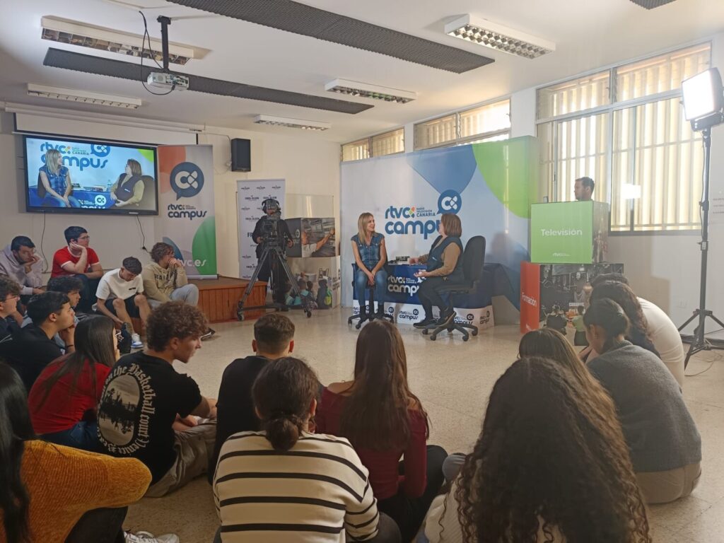 El proyecto educativo ‘Campus RTVC‘ que desarrolla RadioTelevisión Canaria ha llegado este martes 18 de febrero al IES Güímar, en Tenerife, para acercar el funcionamiento de la televisión y otros conocimientos periodísticos a jóvenes estudiantes. Durante dos días, cerca de medio centenar de alumnos de Secundaria y Bachillerato experimentarán cómo se crea un programa en directo mediante la simulación de una grabación en vivo desde un plató de televisión ficticio.