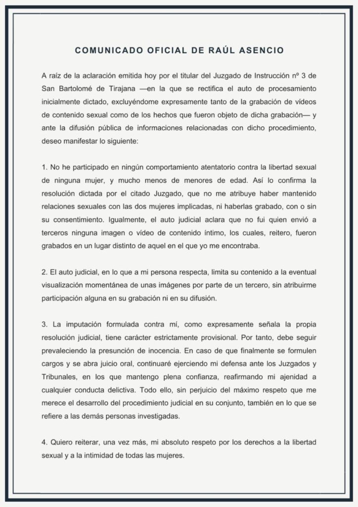 Raúl Asencio, defensa del Real Madrid, aclaró en un comunicado tras la publicación del auto del Juzgado de Instrucción n°3 de San Bartolomé de Tirajana. «Así lo confirma la resolución dictada por el citado Juzgado, que no me atribuye haber mantenido relaciones sexuales con las dos mujeres implicadas, ni haberlas grabado, con o sin su consentimiento», defendió.