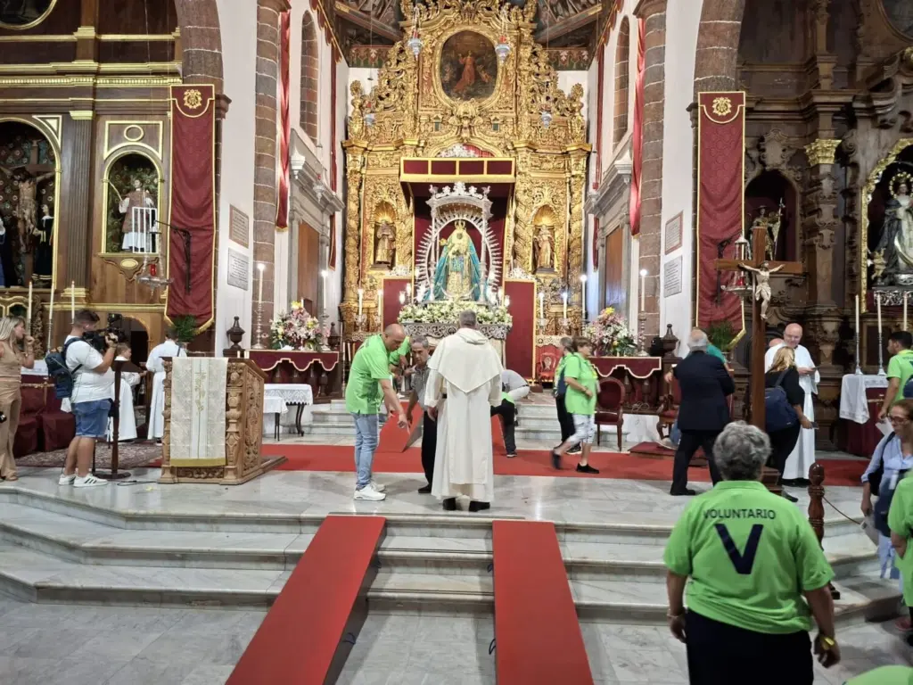 En el interior de la Basílica, la Virgen de Candelaria ya esta posicionada dentro del templo, en el que en unos minutos comenzará la Eucaristía, una homilía que ofrecerá el Obispo Eloy Santiago y que además, será cantada por la Agrupación de Santa Ana y San Blas.