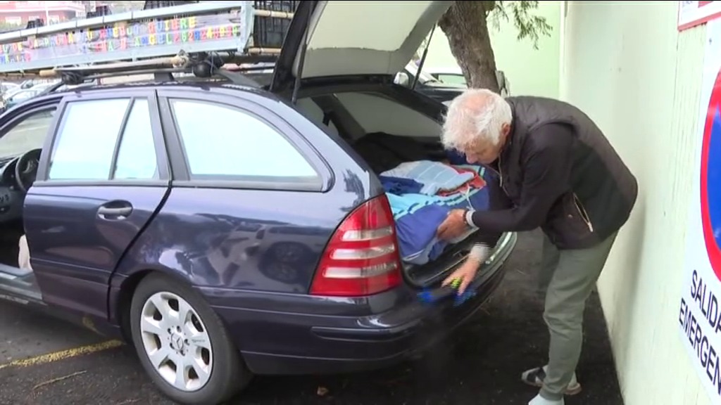 Con su coche, reparte ropa y comida a quienes lo necesitan.