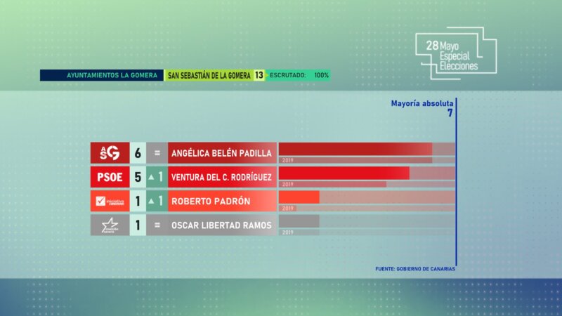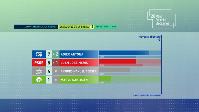 Nueva Canarias – Frente Amplio Canarista logra un concejal al igual que en 2019. La mayoría absoluta está en Santa Cruz de La Palma en nueve concejales.