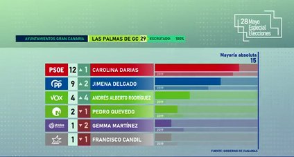 En Las Palmas de Gran Canaria, ha ganado las elecciones con 12 concejales. El PP consigue 9 concejales. VOX entra en el Ayuntamiento de Las Palmas de Gran Canaria con cuatro concejales. Nueva Canarias – FAC logra 2 concejales. Unidas Sí Podemos consigue un concejal igual que Coalición Canaria. La mayoría absoluta está en quince concejales.