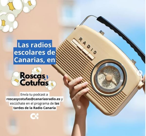 Esta iniciativa anima a todos los centros escolares a enviar al programa de Canarias Radio un podcast a través del correo roscasycotufas@canariasradio.es con el siguiente asunto: RADIO ESCOLAR + NOMBRE CENTRO. Este material, una vez revisado y seleccionado por ‘Roscas y Cotufas’, podrá ser escuchado cada viernes por la tarde, dentro de su horario habitual, entre las 15:00 y las 18:00 horas.