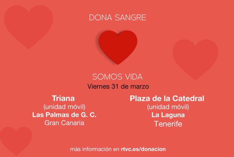 El viernes 31 de marzo, RadioTelevisión Canaria ha puesto en marcha por segundo año consecutivo la campaña ‘Dona sangre, somos vida’, para concienciar a la sociedad de la importancia de donar sangre para salvar vidas. Durante toda la jornada, los diferentes programas de televisión han estado realizando directos en los puntos de extracción de Triana (en Gran Canaria) y de la plaza de la Catedral (La Laguna, Tenerife), a donde varios profesionales de esta casa acudirán a donar sangre.