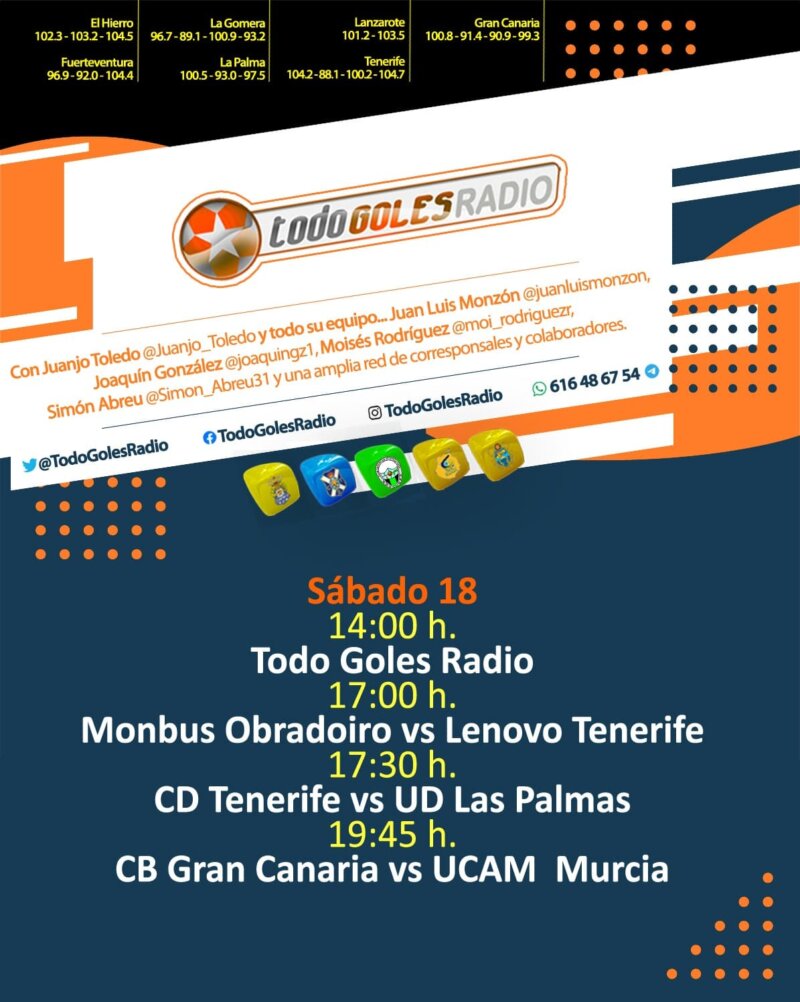 La cadena autonómica retransmitirá el encuentro entre la UD Las Palmas y en CD Tenerife desde las ondas de Canarias Radio con un programa especial que arranca desde las 14:00 horas en ‘Todo Goles Radio’. Juanjo Toledo y todo su equipo realizarán un amplio despliegue para informar a la afición minuto a minuto.