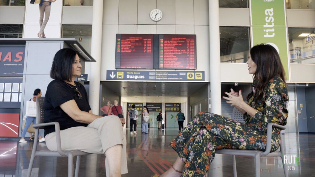 Muy cerca, en uno de los puntos clave del transporte de la isla, el intercambiador de la capital, Yara de León se cita con Eulalia García, consejera de Movilidad del Cabildo de Tenerife. Si bien el Gobierno insular está esforzándose en implementar una mejor infraestructura viaria, García explica que la solución no pasa exclusivamente por añadir carriles a las carreteras, también por reforzar el transporte público colectivo con más guaguas, más modernas, más frecuencia, mejor servicio, carriles dedicados, etcétera. La ampliación de la red del tranvía, el ansiado tren, la necesaria mejora de la infraestructura de recarga y el hidrógeno serán otros temas que estarán sobre la mesa.