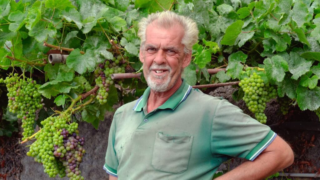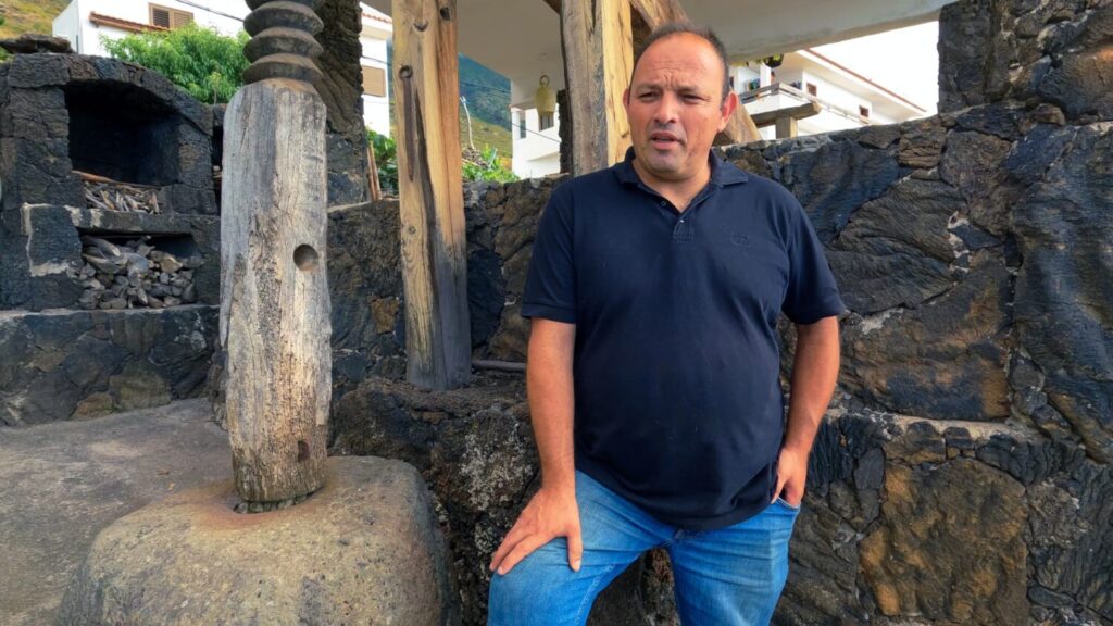 La ruta de sabores también pasa por los vinos tradicionales. Juan Domingo Febles representa la tercera generación de viticultores de su familia. Entre las vides de su finca nos cuenta cómo empezó, de niño, ayudando en la viña a su padre y su abuelo, en tiempos donde la mecanización aún no había llegado a estas tierras.