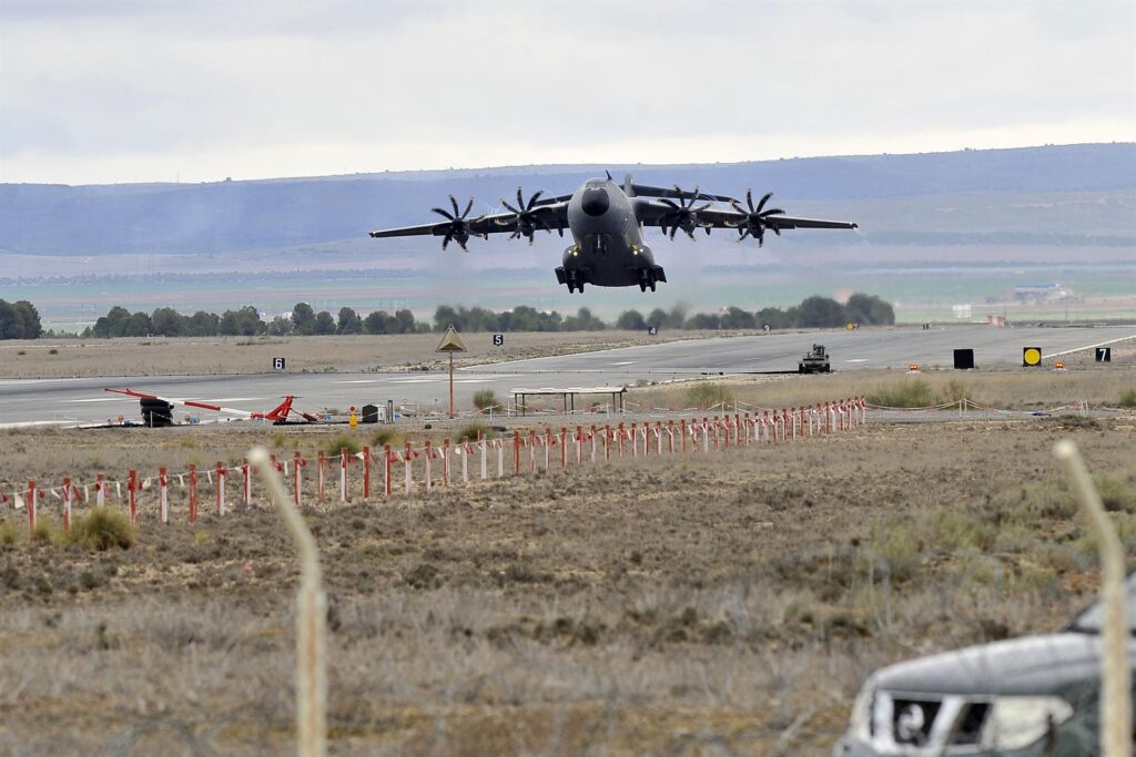 Uno de los dos aviones A400M del Ejército del Aire con el primer envío directo de material ofensivo por parte de España a Ucrania ha salido esta mañana de la base aérea de Los Llanos, en Albacete.