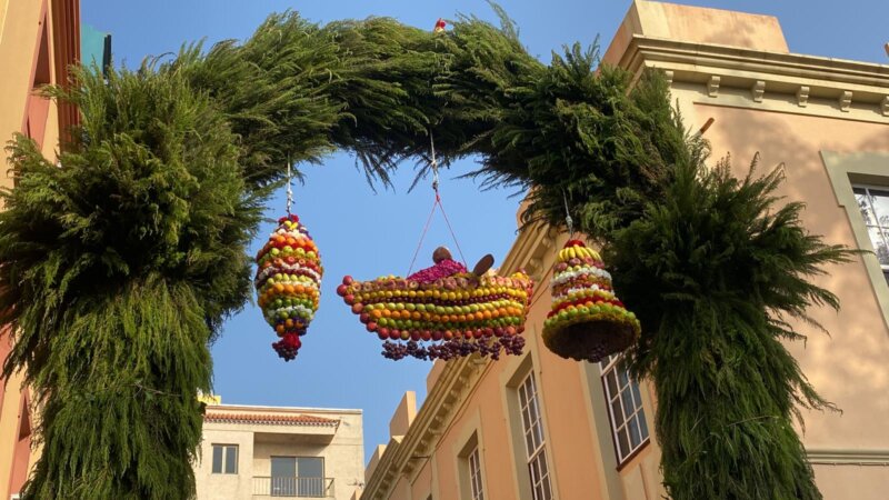 Es popular por este día, que en el municipio luzcan arcos como este adornado con frutas frescas.