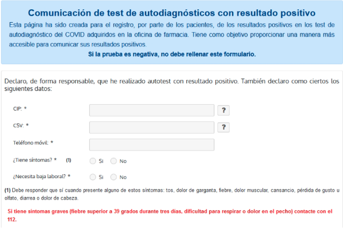 Una vez el ciudadano accede a miautotestcovid.com debe rellenar un formulario que recoge cinco campos: número de tarjeta sanitaria, código seguro de verificación de la tarjeta sanitaria (CSV), teléfono móvil, si tiene o no síntomas y si necesita o no baja laboral.