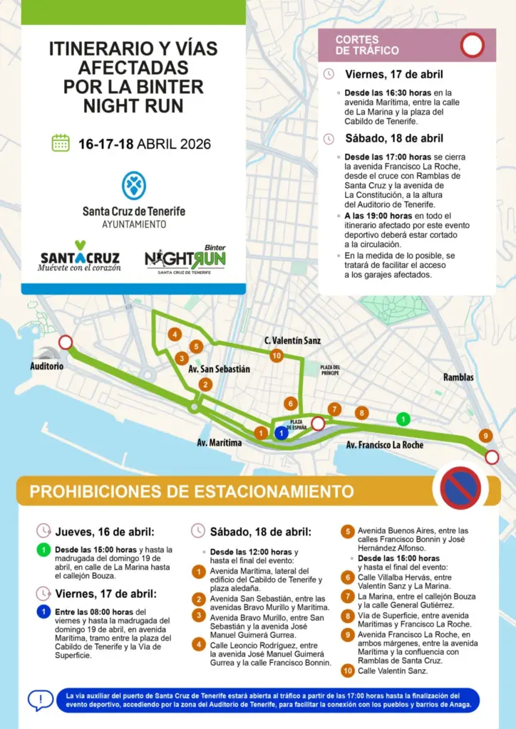 El Ayuntamiento de Santa Cruz, a través del área de Movilidad, que dirige Evelyn Alonso, y en coordinación con la Policía Local, realizará cambios en el tráfico y en los estacionamientos con motivo de la celebración, mañana sábado, de la carrera nocturna “Binter NightRun” para garantizar el correcto desarrollo de la prueba y la seguridad de los participantes.