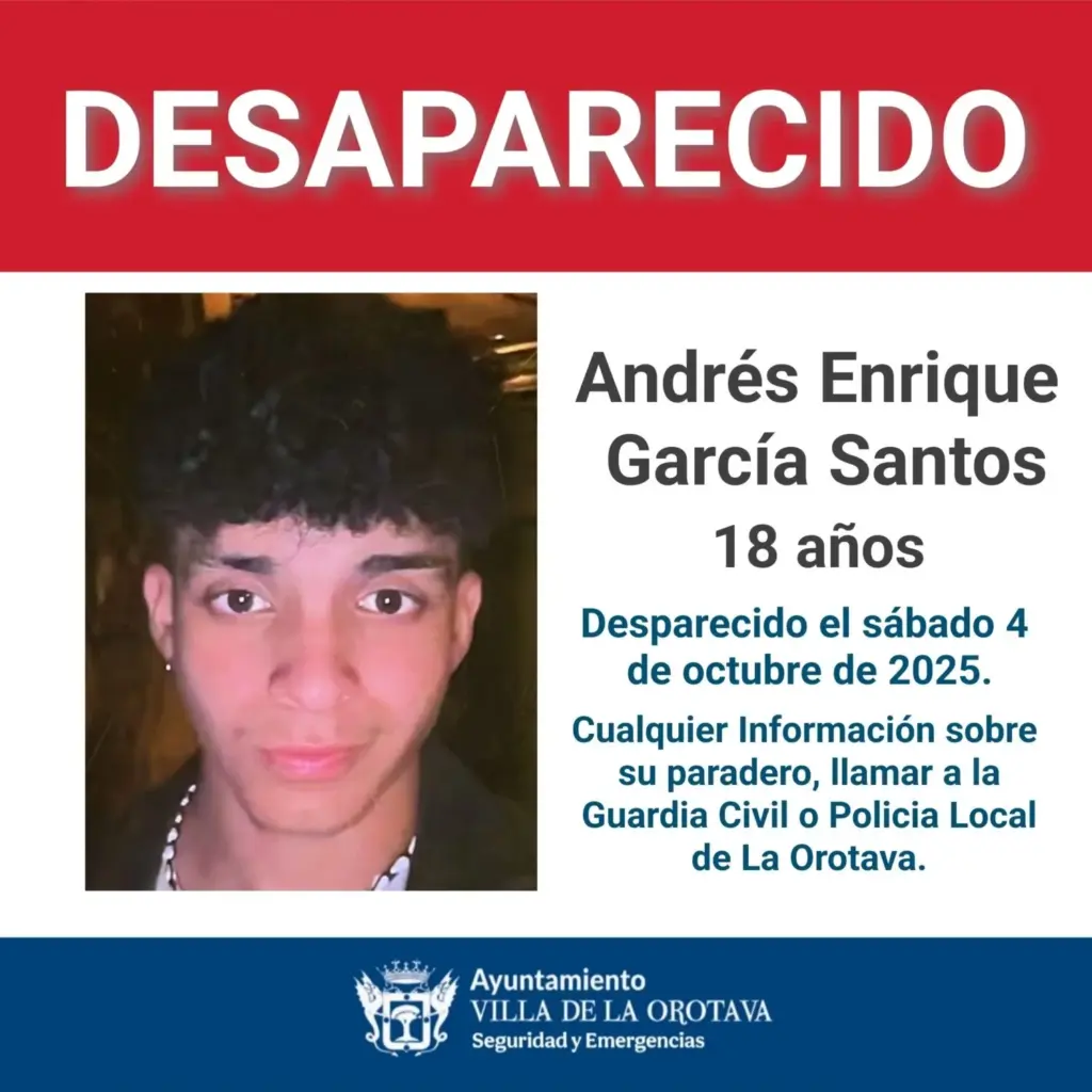 Alerta activada para dar buscar a Andrés Enrique García Santos. Tiene 18 años y desde el comunicado de Protección Civil de La Orotava desapareció este sábado 4 de octubre.