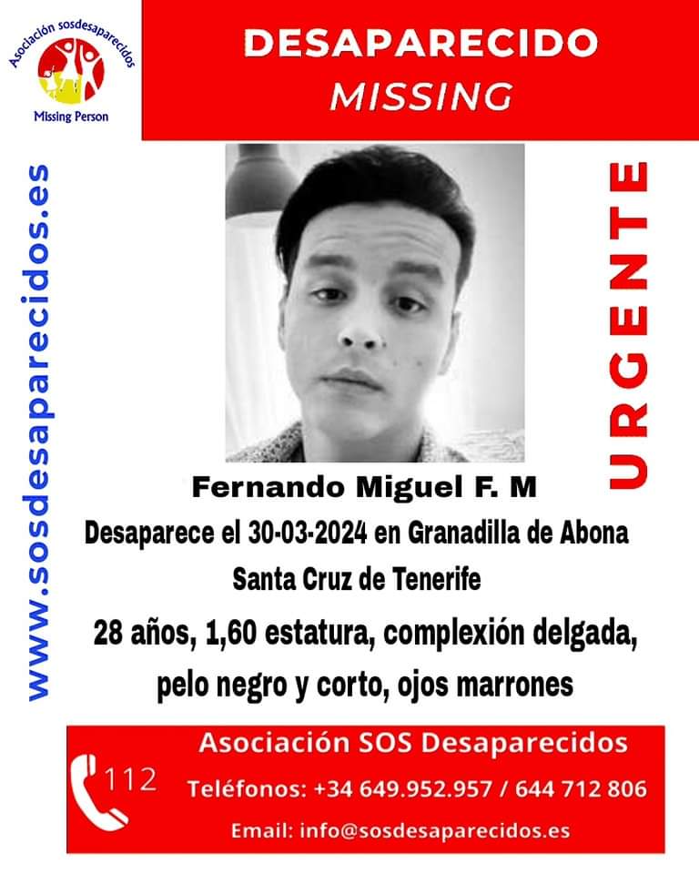 A Fernando Miguel F.M. se le vio por última vez el pasado sábado 30 de marzo en Granadilla de Abona. El desaparecido tiene 28 años y el pelo negro y corto