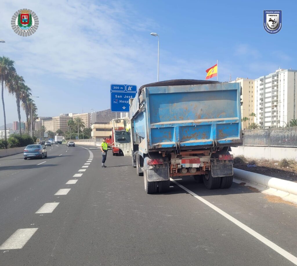 Cerca del mediodía de este jueves 22 de agosto, la rueda de un semirremolque se ha soltado mientras circulaba dirección sur por la GC-1, a la altura de la Comandancia de la Guardia Civil, en Las Palmas de Gran Canaria.