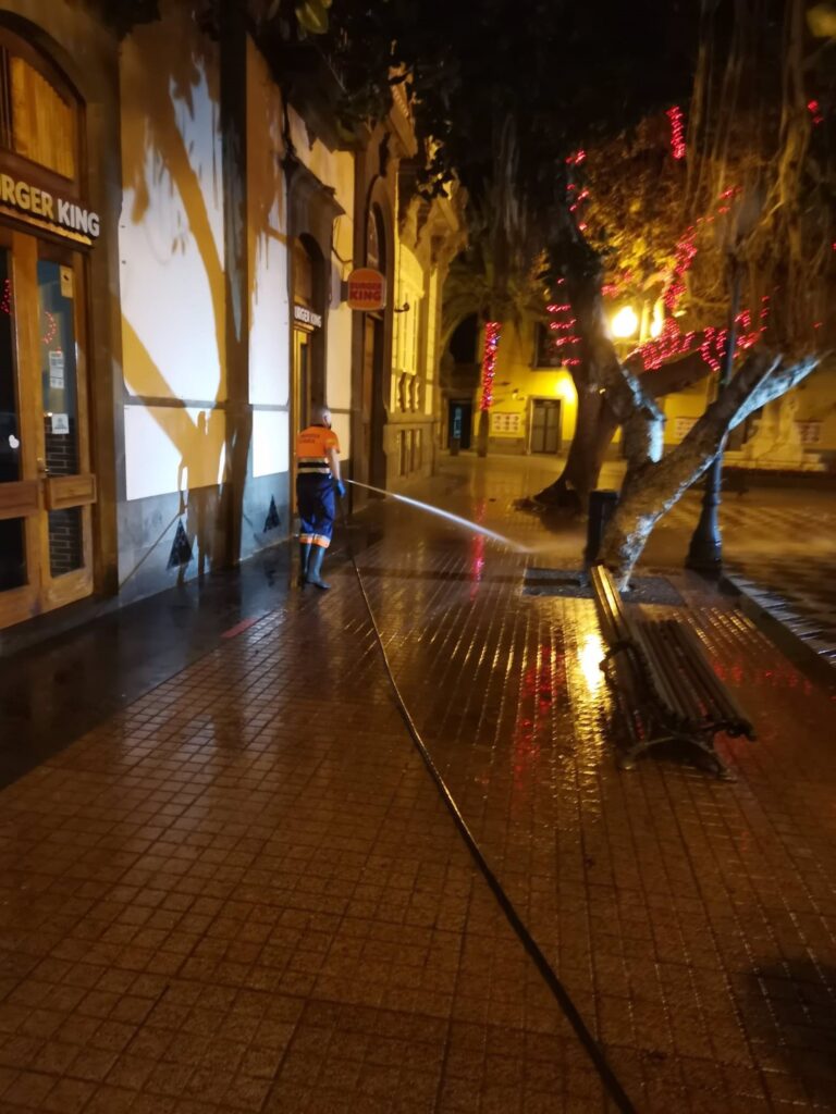 El Ayuntamiento desplegó durante la madrugada de este viernes un dispositivo especial con 49 operarios y 21 máquinas para limpiar en diversos lugares de ocio nocturno de la capital grancanaria. En zonas como el casco histórico de Vegueta, Triana, el parque Romano, Mesa y López, la zona Puerto, Siete Palmas o las inmediaciones del Área Comercial de Tamaraceite. Según informó el Consistorio en nota de prensa.