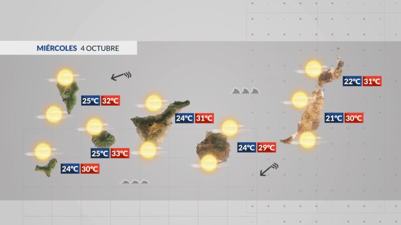 Las previsiones apuntan a que en este episodio de temperaturas anormalmente altas, el día que más se va a notar en las islas será este miércoles. Esperamos máximas que podrían superar los 38 grados en municipios de medianías de la mitad sur de Gran Canaria y en el sur de Tenerife .En el resto el termómetro también superará los 30 grados.