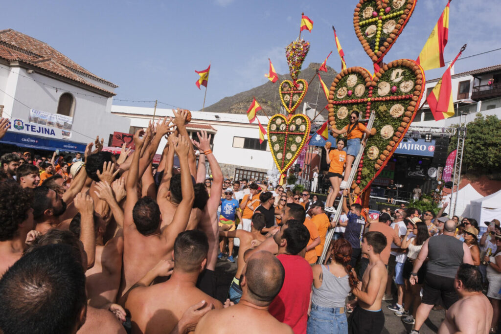 Tras la celebración el pasado domingo de los Corazones de Tejina, en la que los tres barrios que dan forma a este pueblo cerca de la costa elaboran con gran esmero y detalle las decoraciones de tres corazones con fruta, flores y ramas. Estructuras que llegan a medir unos 12 metros de altura y a pesar cerca de 100 kilos.