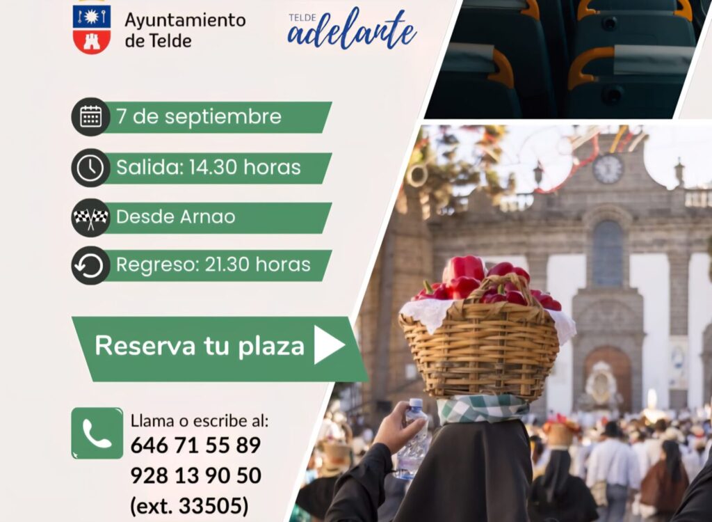 Las guaguas partirán a las 14.30 horas desde la parada de guaguas de Arnao (Avenida del Cabildo) de Telde hacia la Romería del Pino y regresarán desde Teror a partir de las 21.30 horas. El Ayuntamiento recuerda que para participar en la romería es imprescindible acudir vestido con la indumentaria tradicional canaria, reforzando así la identidad y el respeto a las tradiciones.