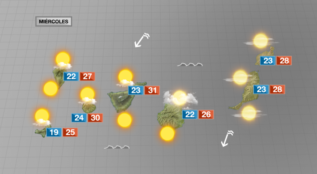 Este miércoles amaneceremos con temperaturas veraniegas y nubosidad de tipo bajo por el norte de las islas a menos de 700 – 800m. Darán paso al sol en horas centrales para regresar al final de la tarde. En el resto, tiempo soleado, salvo intervalos de nubes medias y altas en la provincia oriental. Ligera calima en altura que remitirá por la tarde.