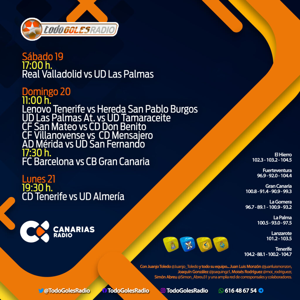 La oferta no acaba ahí, porque este lunes, 21 de marzo, ‘Todo goles radio’ estará en directo a las 19:30 horas en el partido CD Tenerife – UD Almería.