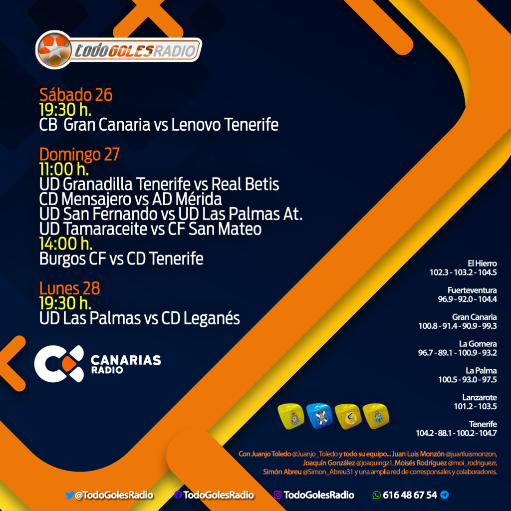De nuevo esta semana ‘Todo goles radio’ afronta por delante un fin de semana extendido de actividad deportiva con sello canario. Juanjo Toledo y todo su equipo estarán en directo en varias citas de sábado a lunes.