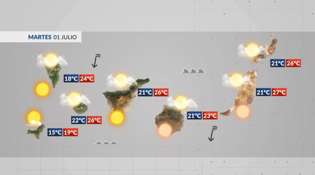 -Tenerife: En interiores del este podrían superar los 32 °C. Cielos nubosos en el norte e intervalos de evolución en el oeste, con posibilidad de alguna gota. Rachas de viento cercanas a los 70 km/h en el área metropolitana.