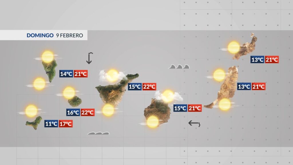 El Hierro: Intervalos de nubes altas durante la primera mitad. Por la tarde habrá intervalos de evolución en interiores, sin descartar que puedan dejar alguna gota. La calima seguirá presente en el ambiente.